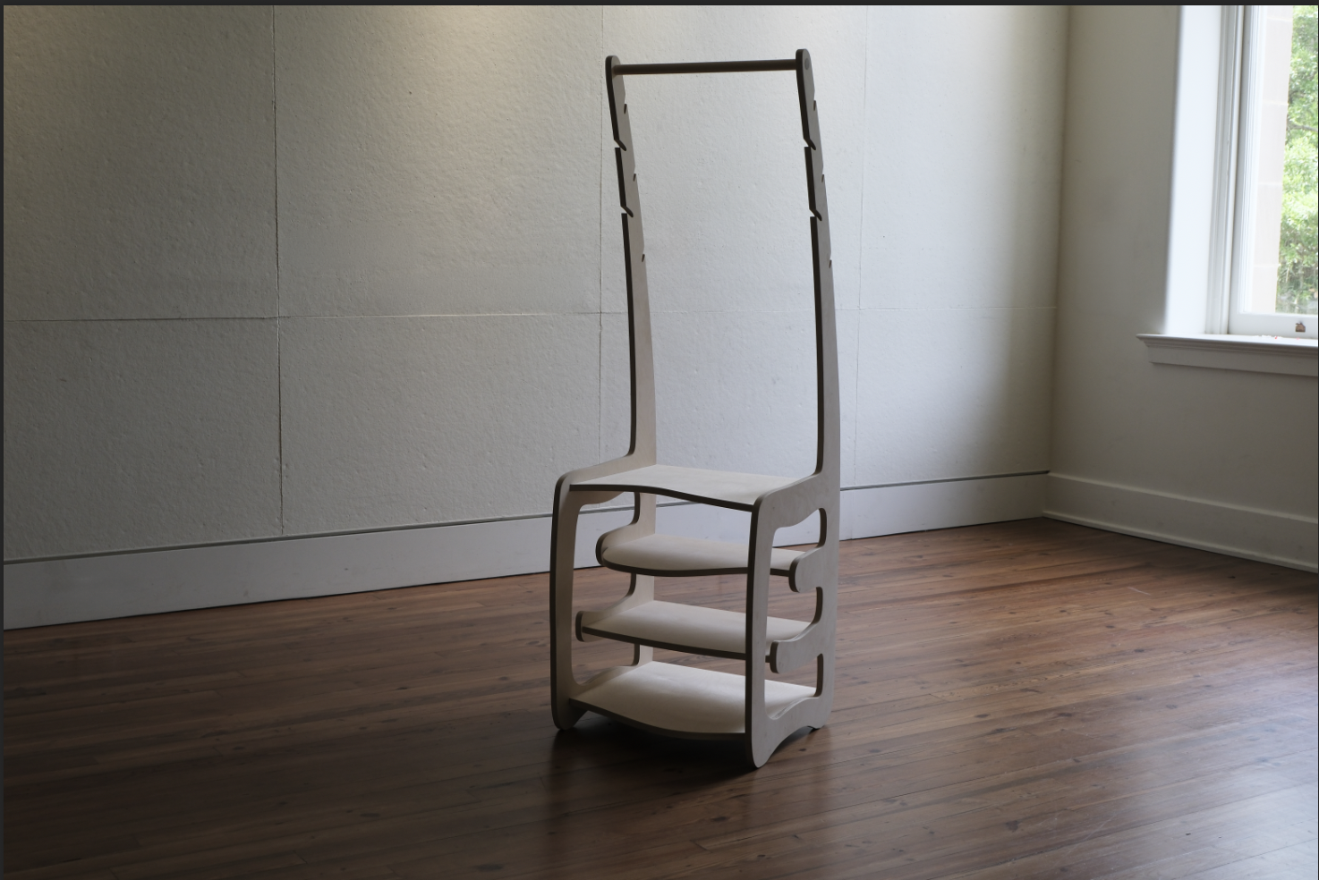 The Self-Service Valet is a portmanteau, a merger of function and decoration into a single novel form. A standing object that holds what you wear and what you love, it combines the utility of storage with the intention of sculpture. Hangers at the top suspend clothing, scarves, and jewelry, while shelves below cradle shoes, books, trinkets, and the objects that define a space. It is not simply a place to put things, but a presence in a room, one that displays the artifacts of a life as much as it organizes them.